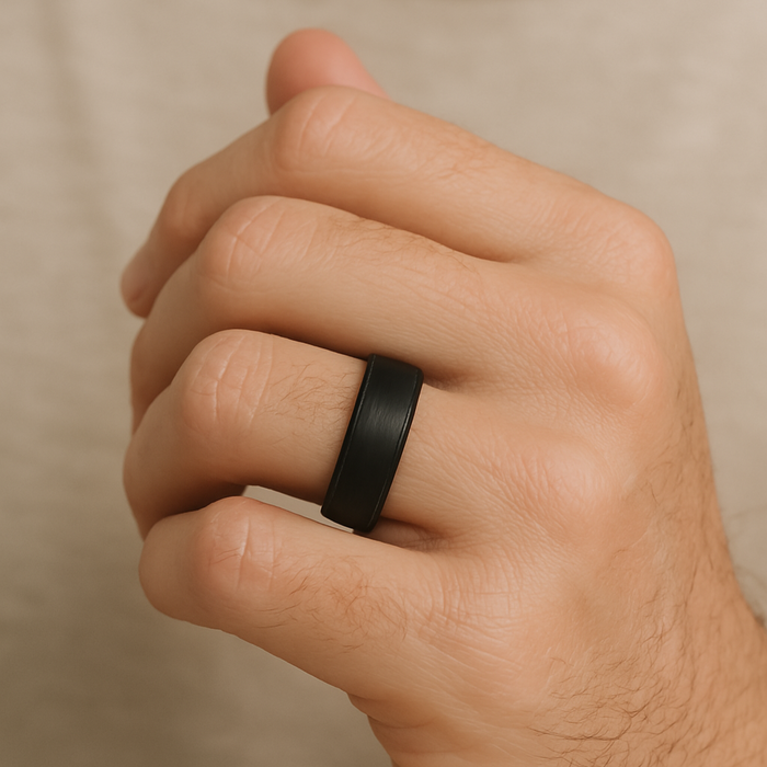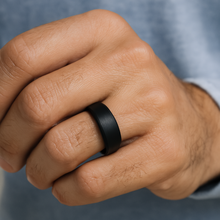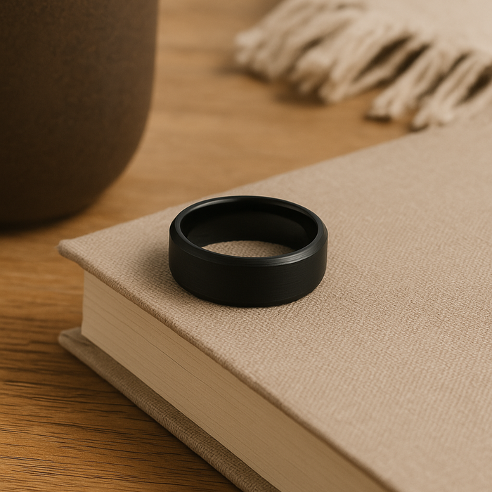 This black tungsten wedding band features a sleek domed design with bevelled edges for a modern touch. The durable tungsten construction ensures long-lasting wear, while the smooth finish provides a comfortable fit and bold style.