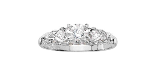 White Gold Three-Stone Round Diamond Engagement Ring with Heart Accents